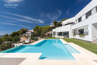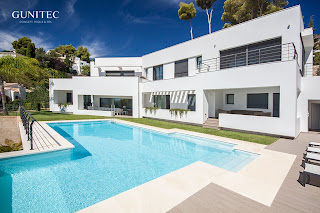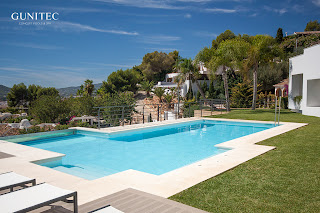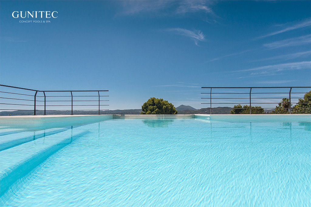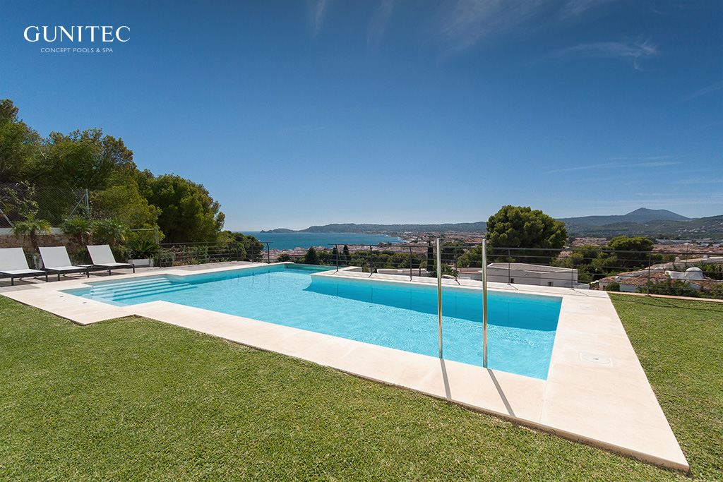 Revestida con piedra caliza en color blanco, bordeamos la piscina con un perímetro de 0,70cm de ancho y un pequeño solarium. El interior tiene un revestimiento de gresite en color blanco dando una uniformidad al conjunto y un color de agua como si de las playas de Fomentera se tratase.