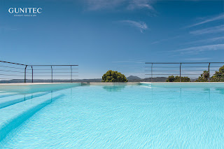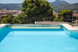 Esta piscina con pared de cristal se trata de uno de nuestros trabajos del pasado año. Se trata de una piscina con pared de cristal que sobresale de la estructura de la base en forma de prisma, con vistas a la pista de paddle y a la bahía de Javea.