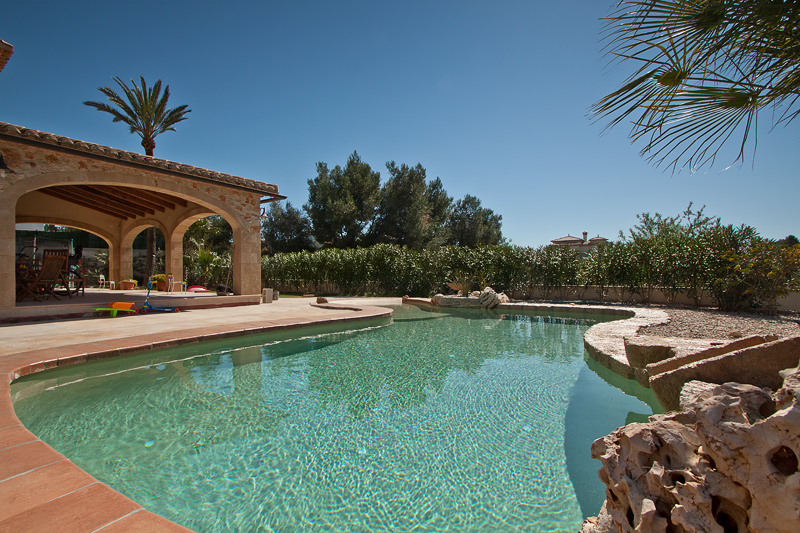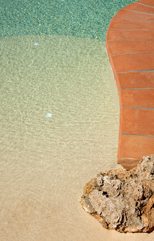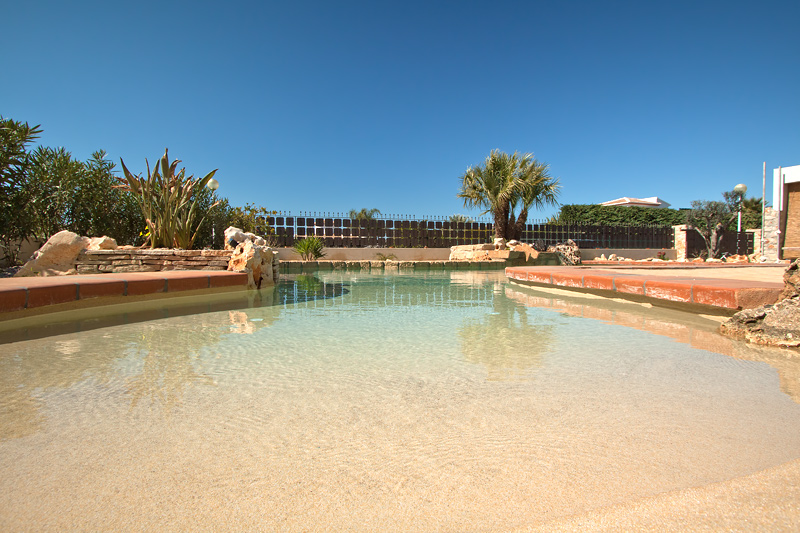 Esta piscina de arena tiene la peculiaridad de haber afrontado algunos cambios en cuanto al proyecto inicial se refiere. Después de unos meses de estar la obra parada con la terraza, coronación, rocallas y jardineras realizadas, los propietarios decidieron terminar la piscina para afrontar la época de verano. Propusimos a los clientes un cambio en el revestimiento final de la piscina, los cuales aceptaron encantados al ver el revestimiento de arenas tropicales.